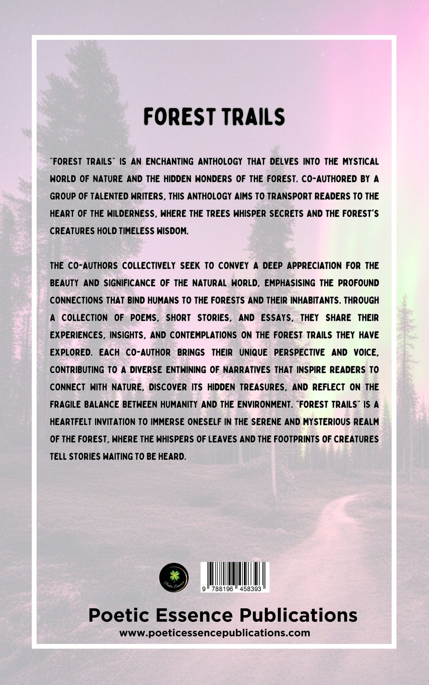 Forest Trails” is an enchanting anthology that delves into the mystical world of nature and the hidden wonders of the forest. Co-authored by a group of talented writers, this anthology aims to transport readers to the heart of the wilderness, where the trees whisper secrets and the forest’s creatures hold timeless wisdom. The co-authors collectively seek to convey a deep appreciation for the beauty and significance of the natural world, emphasising the profound connections that bind humans to the forests and their inhabitants. Through a collection of poems, short stories, and essays, they share their experiences, insights, and contemplations on the forest trails they have explored. Each co-author brings their unique perspective and voice, contributing to a diverse entwining of narratives that inspire readers to connect with nature, discover its hidden treasures, and reflect on the fragile balance between humanity and the environment. “Forest Trails” is a heartfelt invitation to immerse oneself in the serene and mysterious realm of the forest, where the whispers of leaves and the footprints of creatures tell stories waiting to be heard.