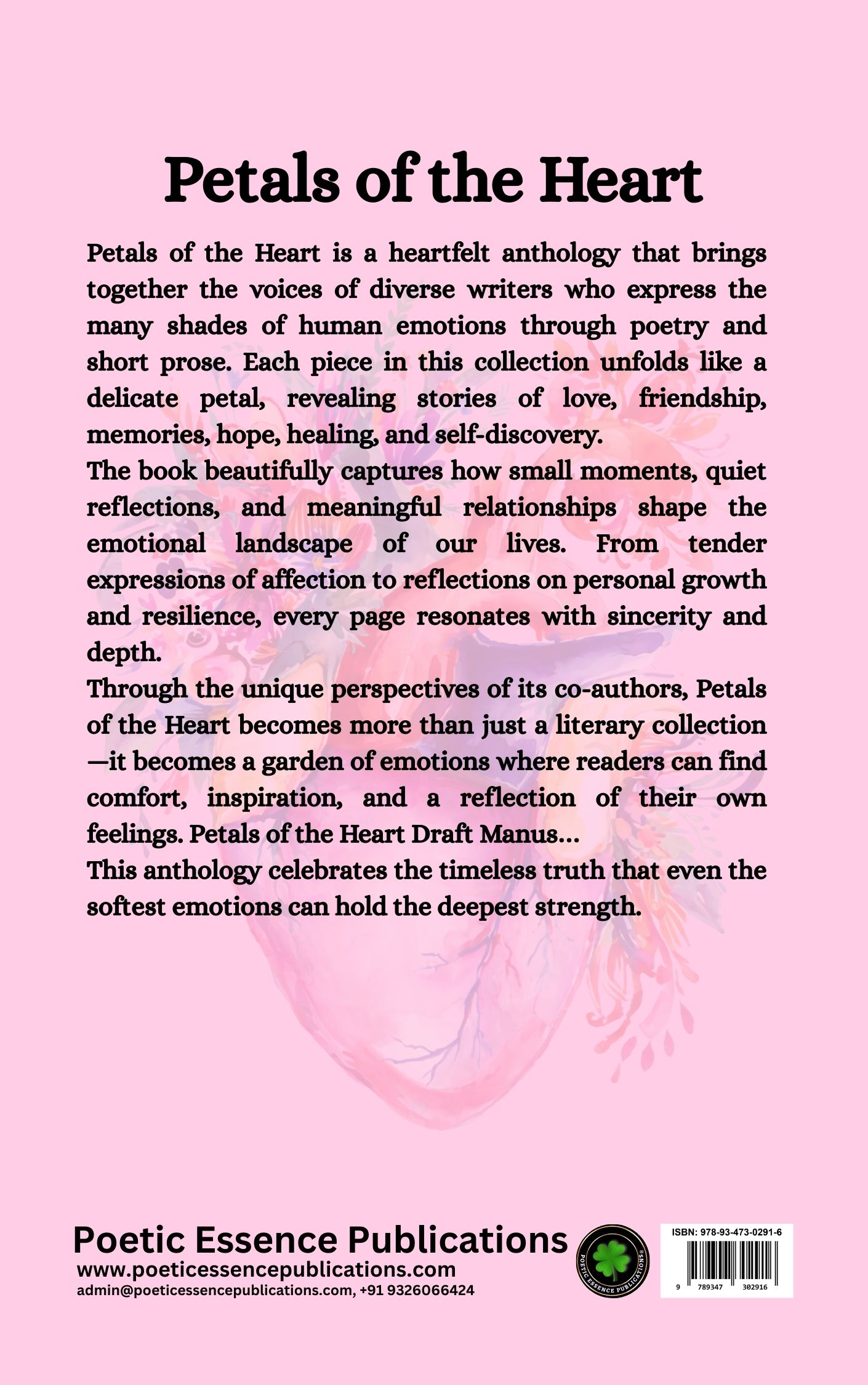 Petals of the Heart is a heartfelt anthology that brings together the voices of diverse writers who express the many shades of human emotions through poetry and short prose. Each piece in this collection unfolds like a delicate petal, revealing stories of love, friendship, memories, hope, healing, and self-discovery.