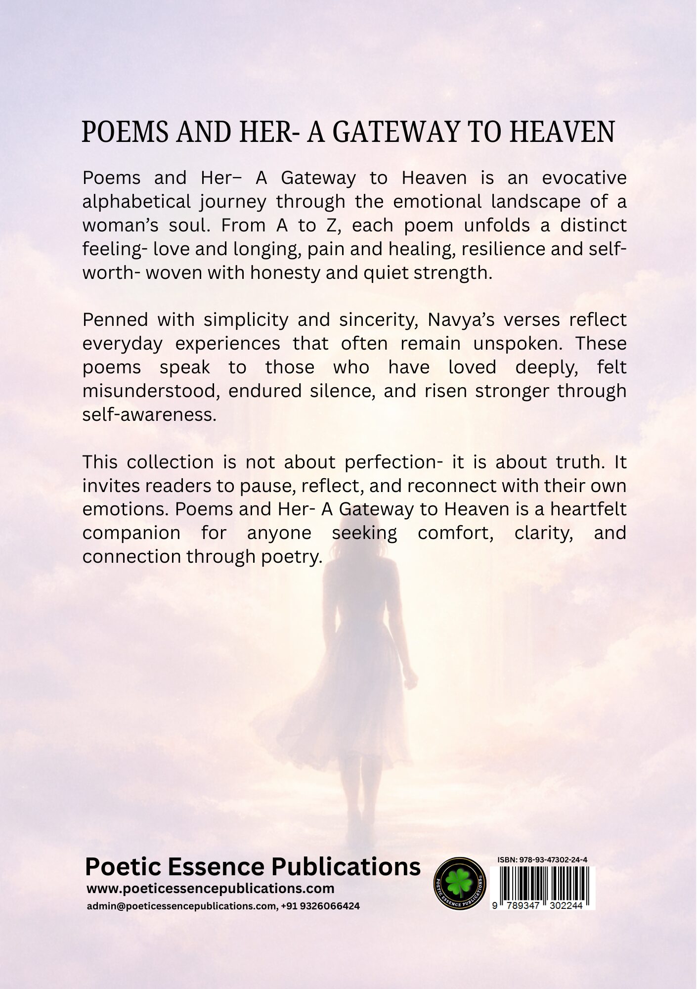 Poems and her– A Gateway to Heaven is an evocative alphabetical journey through the emotional landscape of a woman’s soul. From A to Z, each poem unfolds a distinct feeling- love and longing, pain and healing, resilience and self-worth- woven with honesty and quiet strength.